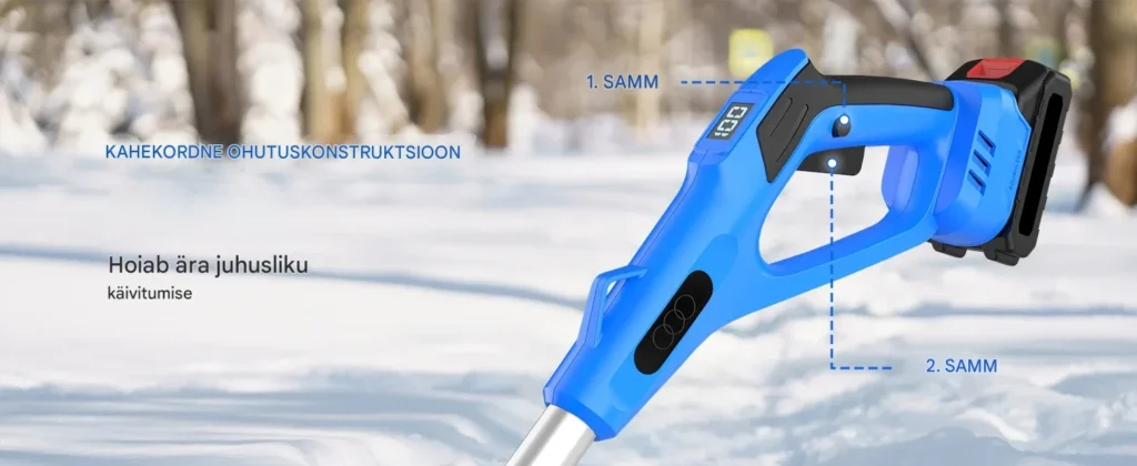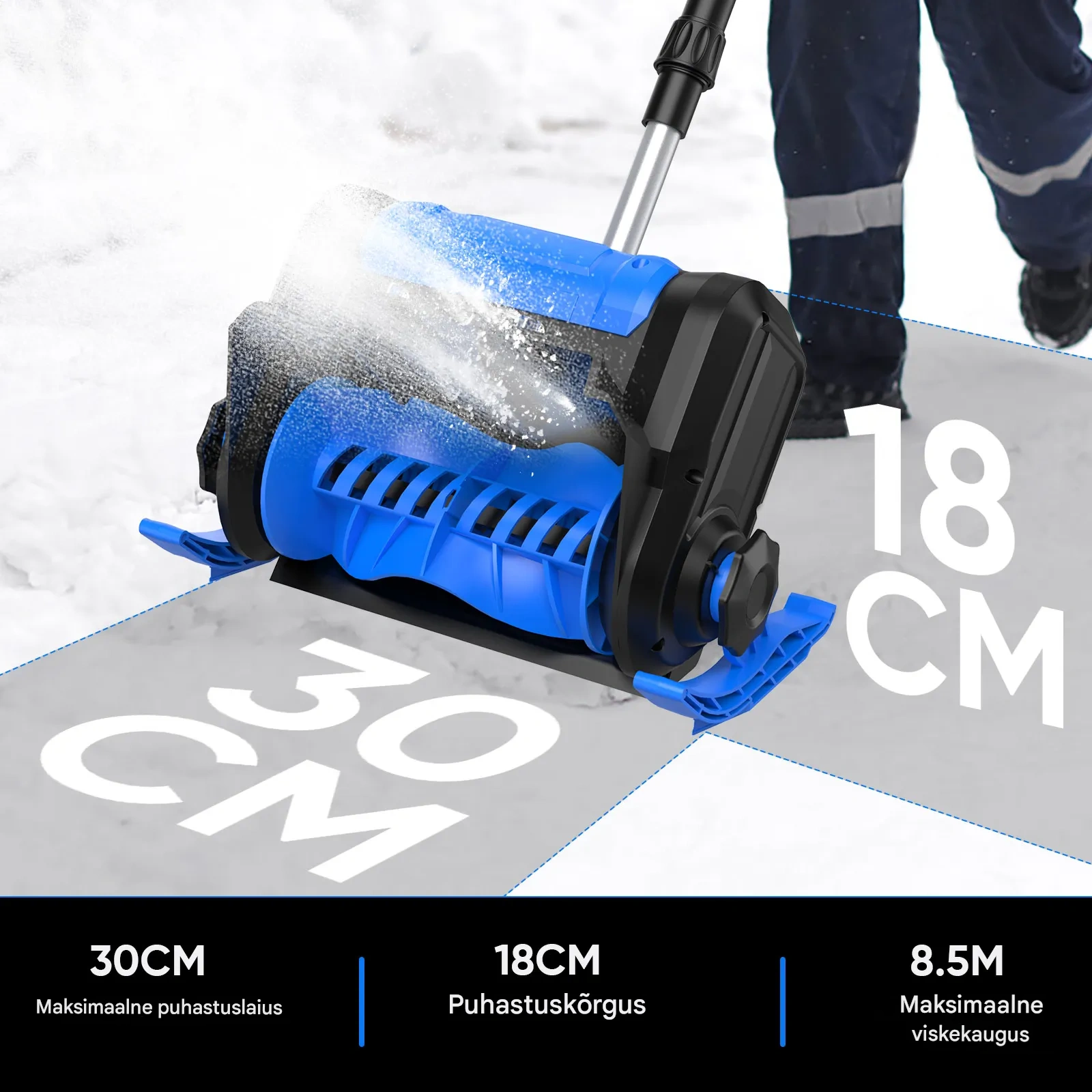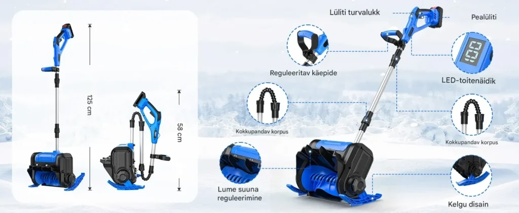 Akulumepuhur ehk aku lumelabidas. Kokkupandav käepide ja teleskooptoru teevad kasutamise mugavaks ning hoiustamise lihtsaks.