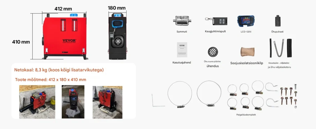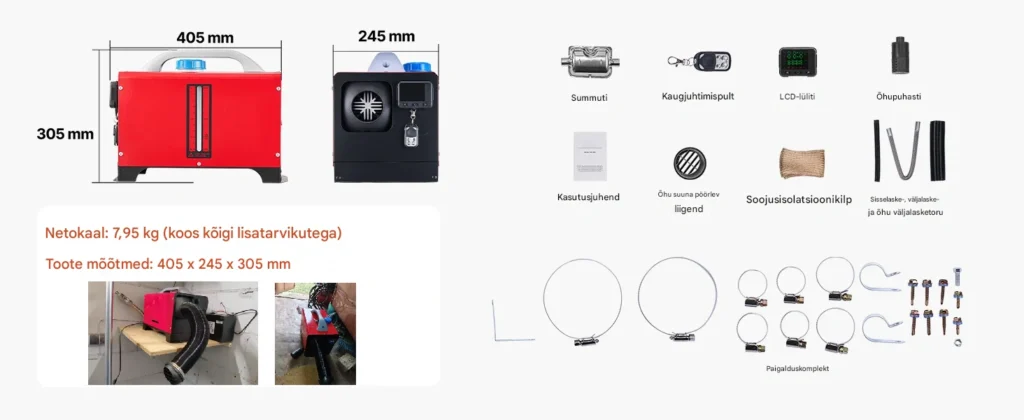 Komplektis: diiselpuhur, summuti, kaugjuhtimispult, LCD-juhtpaneel, õhufilter, kasutusjuhend, õhu suuna pöörlev liigend, soojusisolatsiooniklapp, sisselaske- ja väljalasketorud, kinnitusklambrid, paigalduskonksud, kruvid, poldid, mutrid ja paigalduskomplekt.