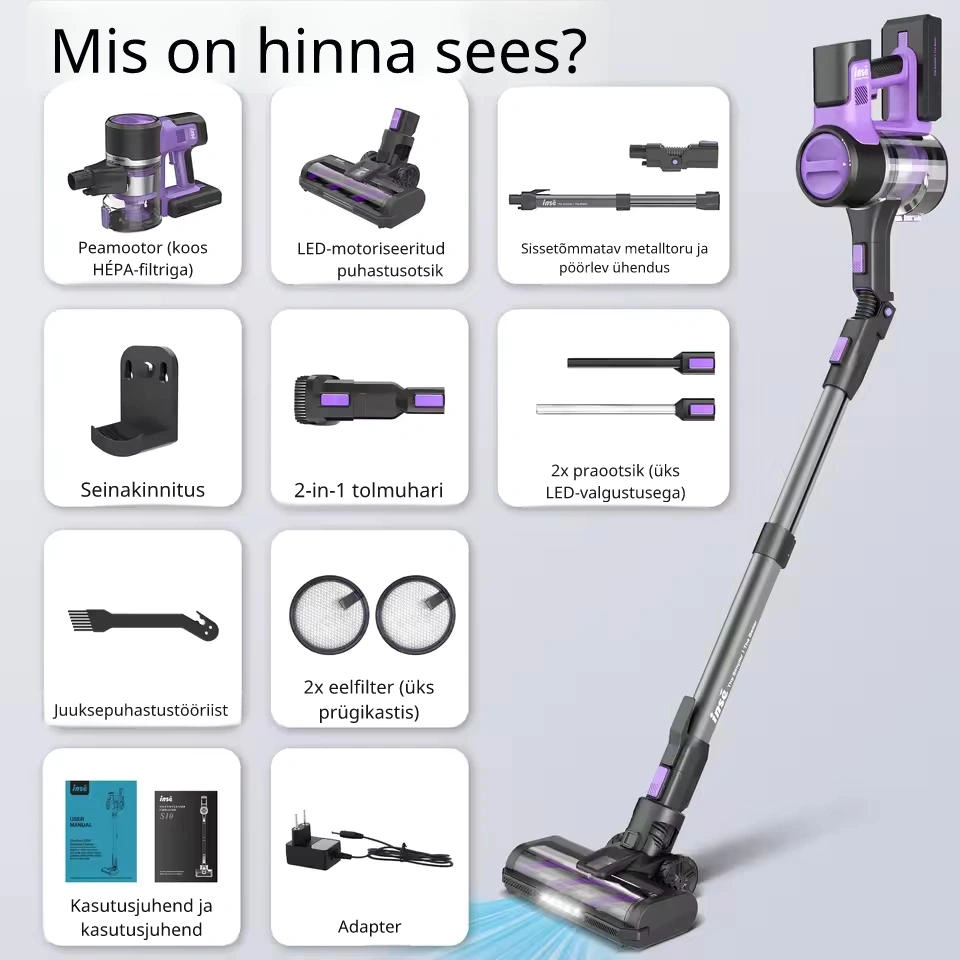Tugeva 45Kpa imemisvõimsusega varstolmuimeja, mis sobib igapäevaseks koristamiseks. Eemaldab tolmu, karvu ja puru kõigilt pindadelt. Eemaldatav aku tagab kuni 50 minuti tööaja. LED-valgustusega põrandaotsik aitab puhastada ka pimedamaid nurki. Mugav kasutada nii käsitolmuimejana kui ka täispikkuses mudelina.