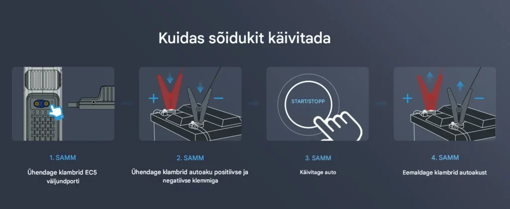 | Funktsioonid | Käivitusabi, akupank, LED-taskulamp, SOS- ja vilkuv hoiatustuli |