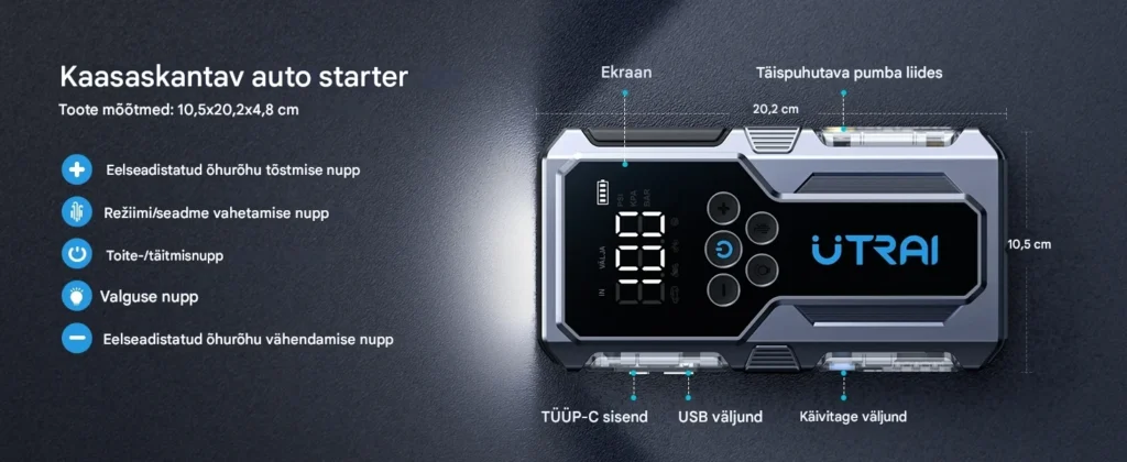 Mitmefunktsiooniline käivitusabi, mis ühendab auto käivitamise, akupanga, LED-taskulambi ja sisseehitatud õhukompressori. Sobib igapäevaseks kasutamiseks sõiduautodel ja väiksematel diiselmootoritel.