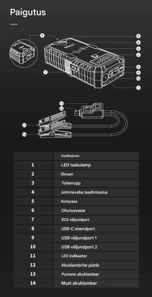 | Funktsioonid | Käivitusabi, akupank, LED-taskulamp, SOS- ja hoiatustuli |