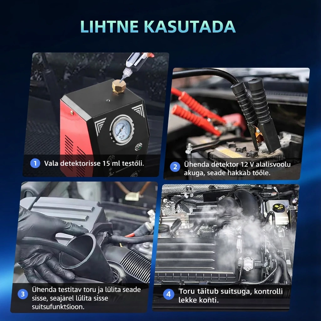 Lekete tuvastuse suitsugeneraator aitab kiiresti leida lekked autode ja mootorrataste süsteemides. Tänu sisseehitatud õhupumbale ei ole vaja välist õhuallikat, tuleb lihtsalt lisada 20 ml beebiõli või glütseriini ja alusta testi. Sobib EVAP-süsteemidele, vaakumleketele, madalrõhuga turbolaadijate lekketele, sisselaskesüsteemidele, jahutus- ja EGR-süsteemidele ning heitgaasisüsteemidele.