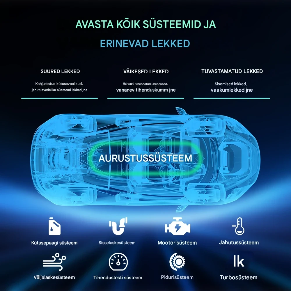 | Funktsioonid | EVAP-süsteem, vaakumleked, turbo lekked, sisselaskesüsteem, jahutus/EGR/heitgaasisüsteem |