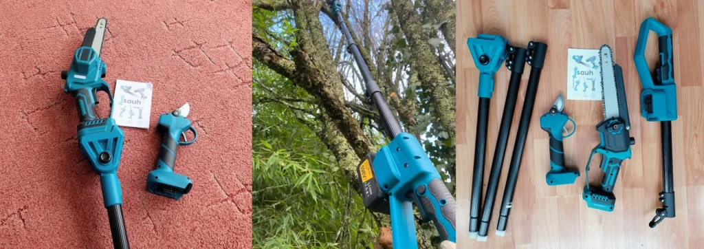 Komplekti kuulub: 1 akukoksakäärid, 1 akukettsaag 20cm, 1 teleskoopvarras 2,4m.