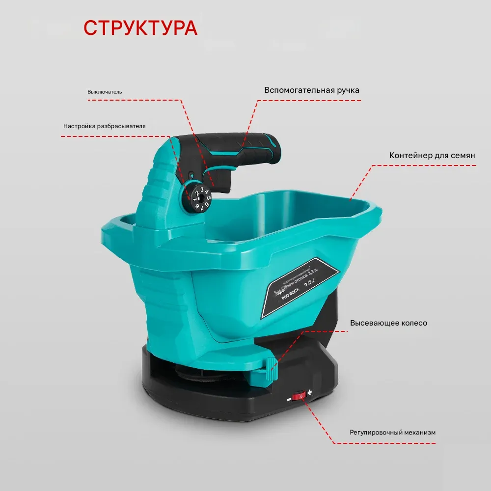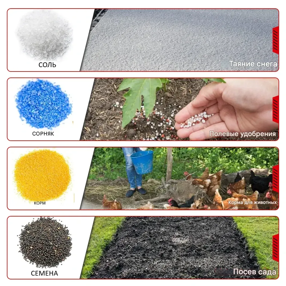 Аккумуляторная сеялка, подходящая для разбрасывания семян газона, удобрений, кормов для животных и гранул для борьбы с гололедом.