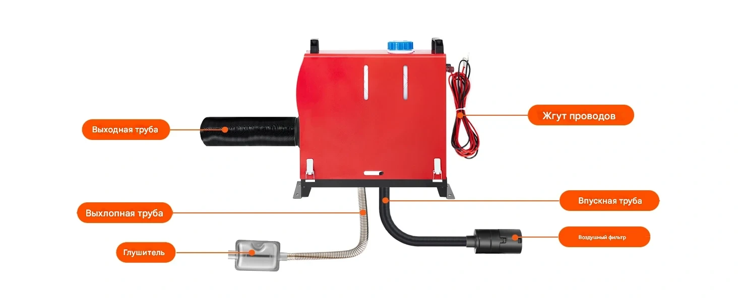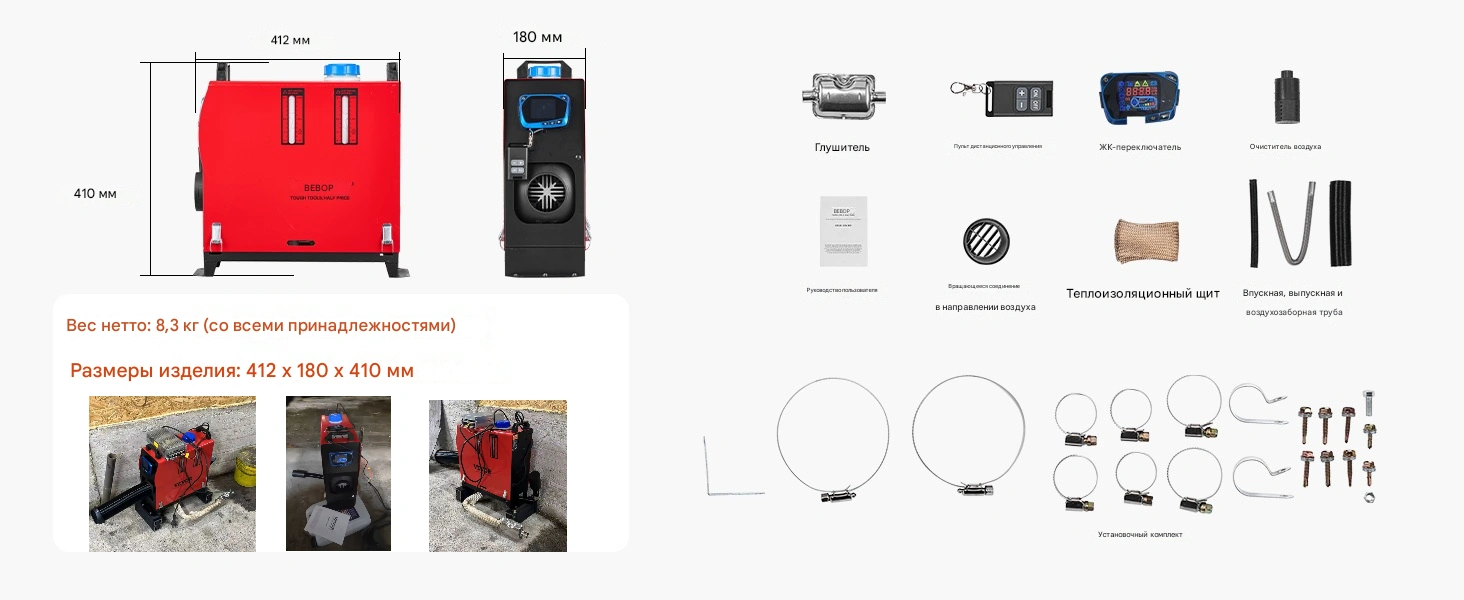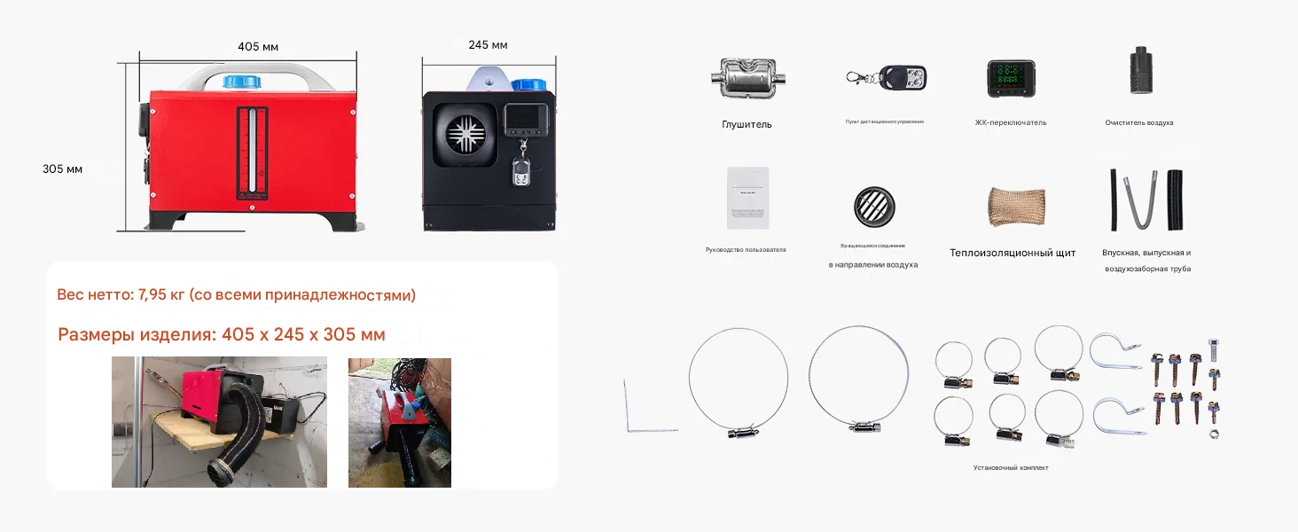 В комплекте: дизельный воздуходув, глушитель, пульт дистанционного управления, ЖК-панель управления, воздушный фильтр, инструкция по эксплуатации, поворотный шарнир для направления воздуха, теплоизоляционный клапан, впускные и выпускные трубы, крепежные зажимы, монтажные крюки, винты, болты, гайки и монтажный комплект.