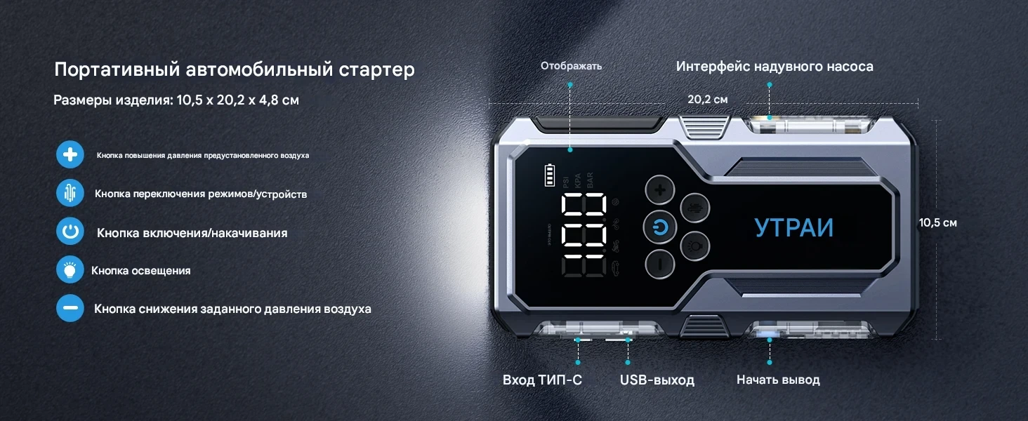 | Функции | Стартовое устройство, внешний аккумулятор, светодиодный фонарик, SOS-сигнал и мигающий предупреждающий сигнал |
