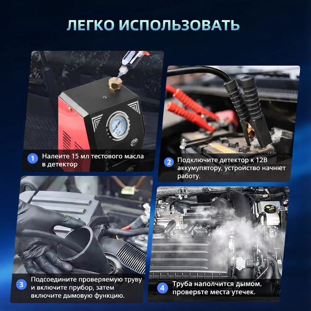 Дымогенератор для обнаружения протечек помогает быстро найти утечки в системах автомобилей и мотоциклов. Благодаря встроенному воздушному насосу не требуется внешний источник воздуха, достаточно добавить 20 мл детского масла или глицерина и начать тест. Подходит для систем EVAP, вакуумных утечек, утечек в турбонагнетателях низкого давления, систем впуска, систем охлаждения и EGR, а также систем выхлопных газов. Переведено с помощью DeepL.com (бесплатная версия)